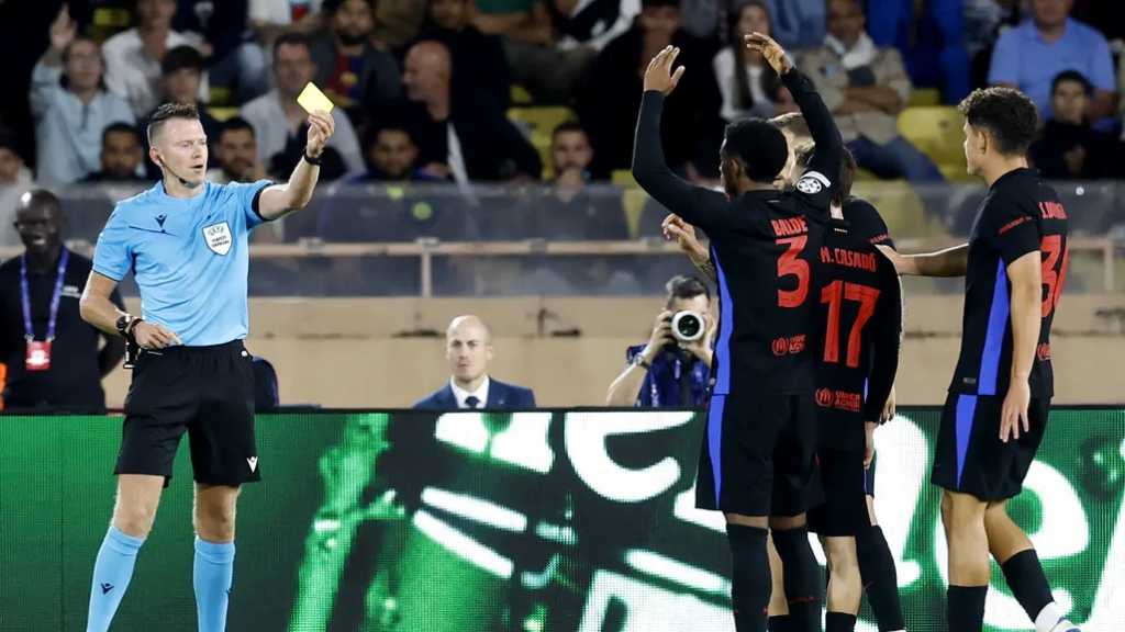 Varios jugadores del Barça se quejan al árbitro durante el Mónaco-BarçaEFE